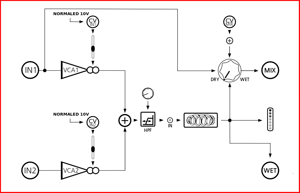 – “MIX” is the mix of DRY signal and the output of reverb tank. It has CV control