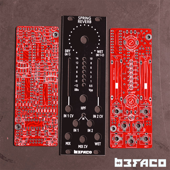 This is our take on an analog spring reverb module. Featuring VCAs for the two available inputs (with different routing), CV control for DRY/WET and visual feedback for signal levels at input and output of the tank.
