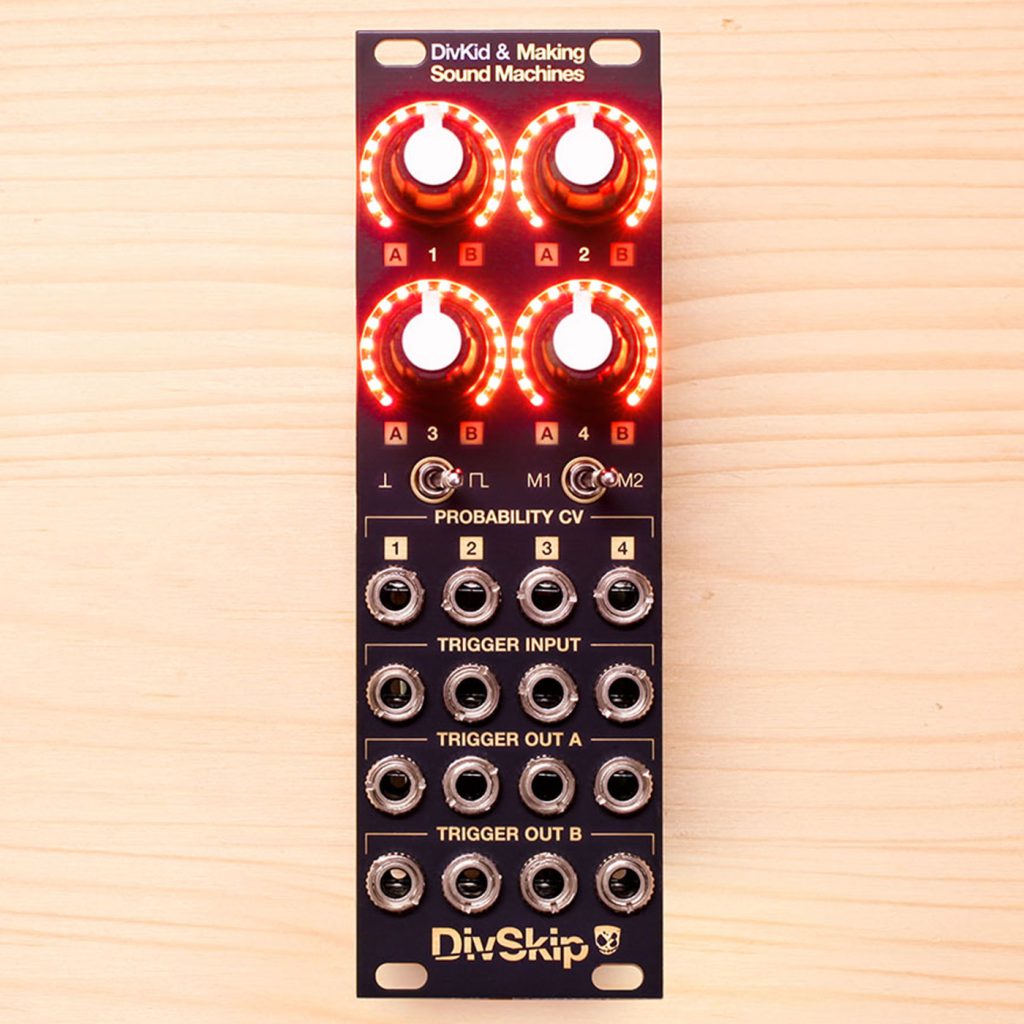 DivSkip is a four channel trigger & gate processor for Eurorack . Eight modes on four independent channels make this 8HP module a Swiss Army Knife to pair with clock utilities, trigger sequencers, and logic modules.