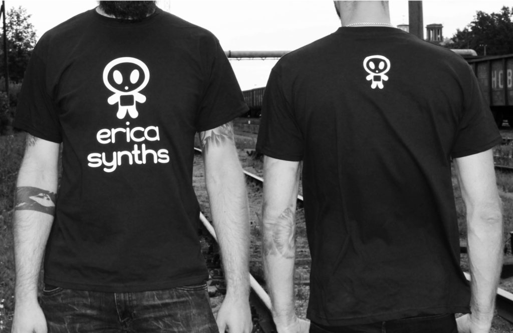 Black, 100% cotton T-Shirt with white Erica Synths logo printed on front and back.