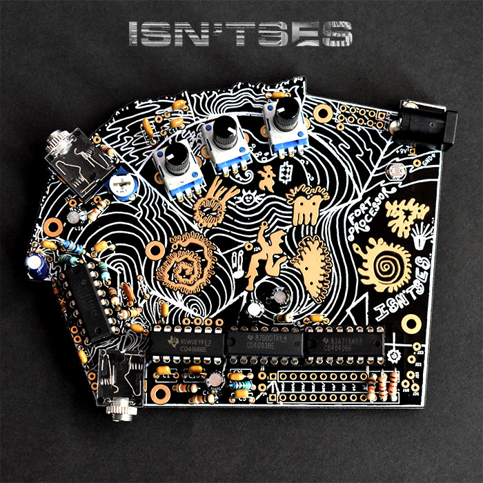 The Fort Processor is an experimental noise synthesiser and audio effect circuit designed by harsh fun noise duo ISN’TSES (Tim Drage & Lisa McKendrick) for Fort Process sound art festival. This event takes place in the tunnels and bunkers of Newhaven Fort on the Sussex coast, and the electronics and artwork of the synth are based on the layout of the site, with inspiration from the surrounding landscape and ocean.