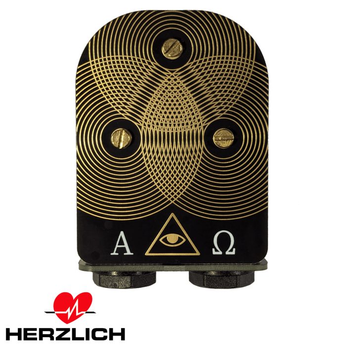 4. A bass oscillator/filter/beat/drone generator, mutated from the classic ‘Twin-T’ analog kick drum circuit. This is triggered and influenced by the audio input and is controlled by the 1st and 3rd knob in conjunction with the trimmer pot. Knob 1 controls the decay envelope; turned anticlockwise this produces more percussive sounds, while turning it clockwise makes bass drones. When turned fully-clockwise it gets quiet to allow the other noises to cut through. The 3rd knob and the trimmer pot interact with each other to control the pitch of this section. The trimmer can be gently turned with a small screwdriver and can be viewed as a tuner to achieve either a resonant drum-like sound, or a more continuous bass tone. The trimmer should be tweaked before playing according to each users personal preferences. Expect random and unpredictable results from this section according to how the rest of the sections are influencing it.