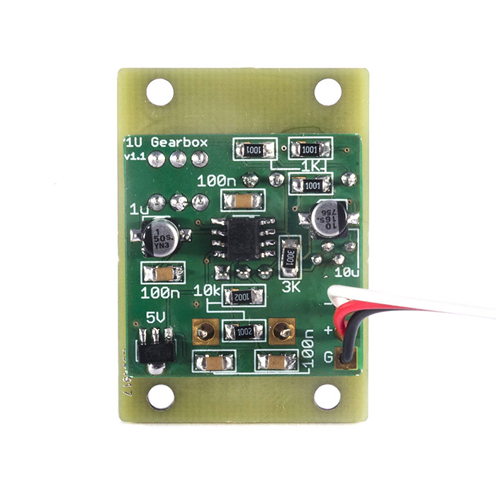 The Gearbox is a variable clock source. The output of the module produces a 0-5V square wave, at frequencies from around 100mhz up to 500hz, across three ‘gears’ or frequency ranges. An RGB LED blinks in time with the clock output, changing its colour to reflect which gear the Gearbox is in.