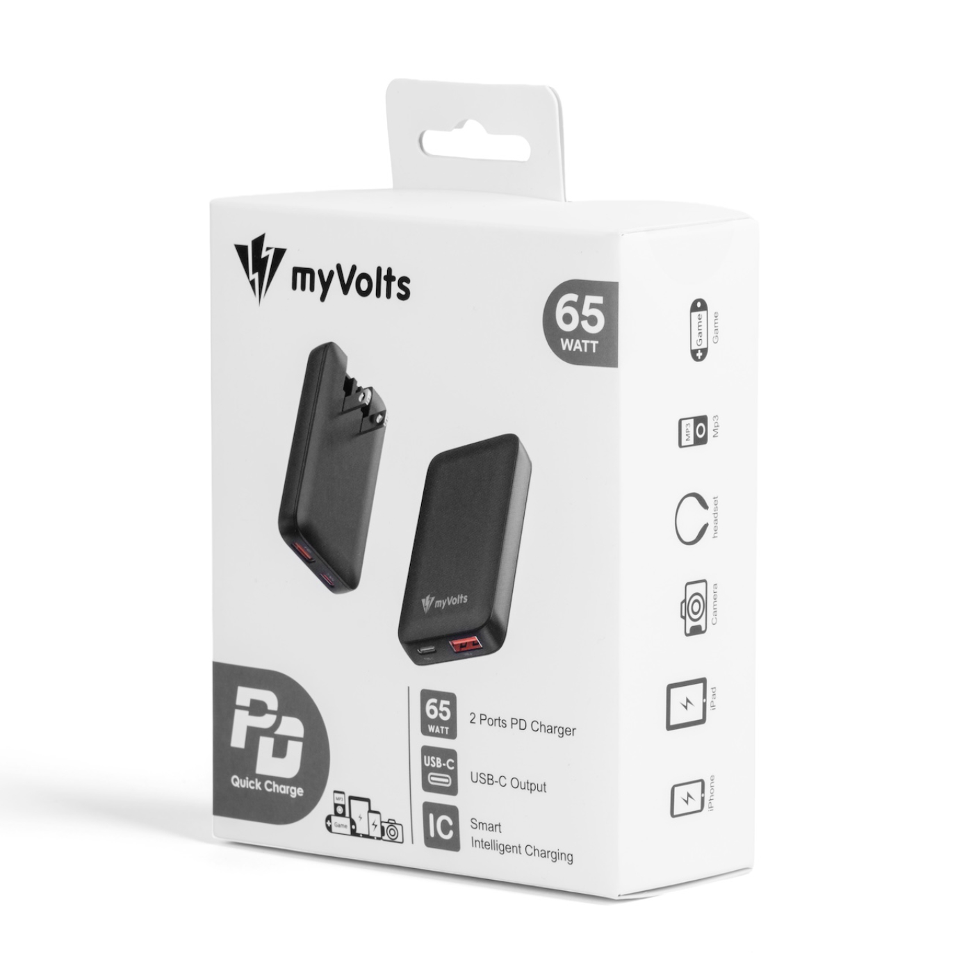The myVolts wall plug to USB PD 65W converter supports the Power Delivery (PD) protocol.