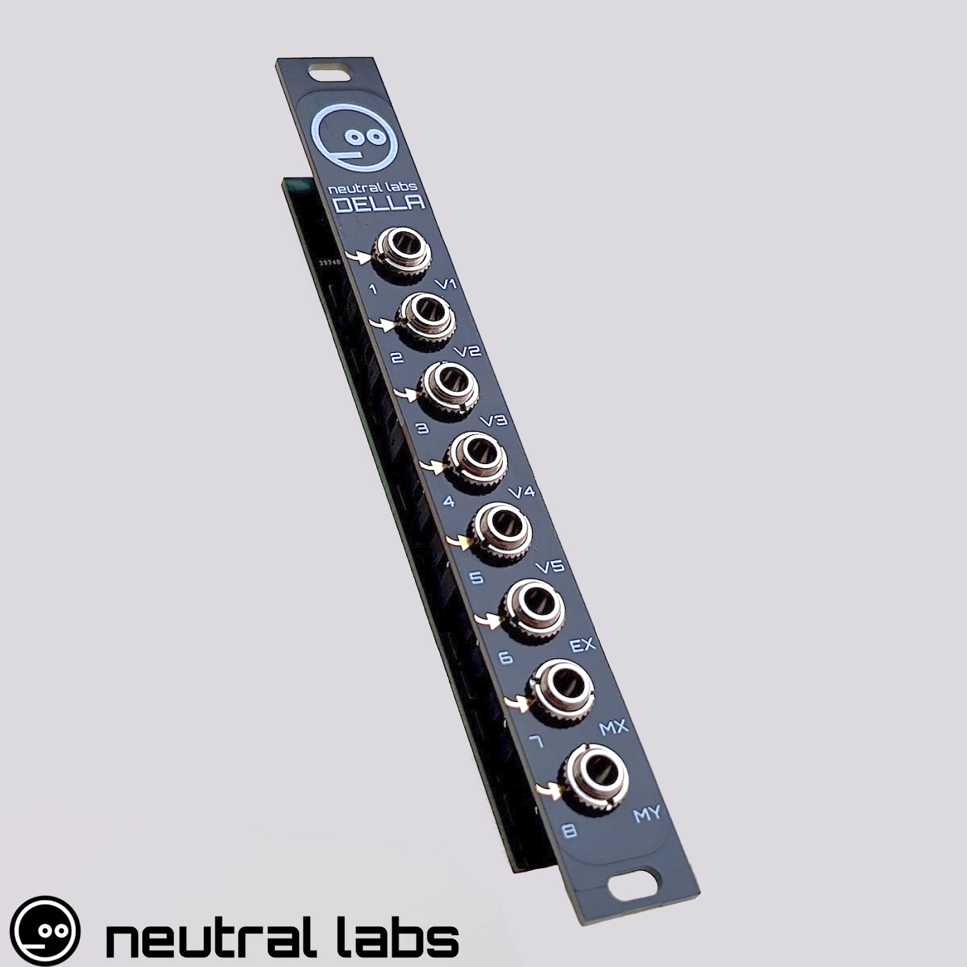 Della is a 3HP Eurorack expander module for Scrooge. This module is completely passive, and performs the simple function of exposing all 8 sequencer tracks to the outside world via dedicated sockets. Della is intended to be used with the Eurorack DIY version of Scrooge. Della connects to a header on the back of the Scrooge module, which is inaccessible in the desktop version.