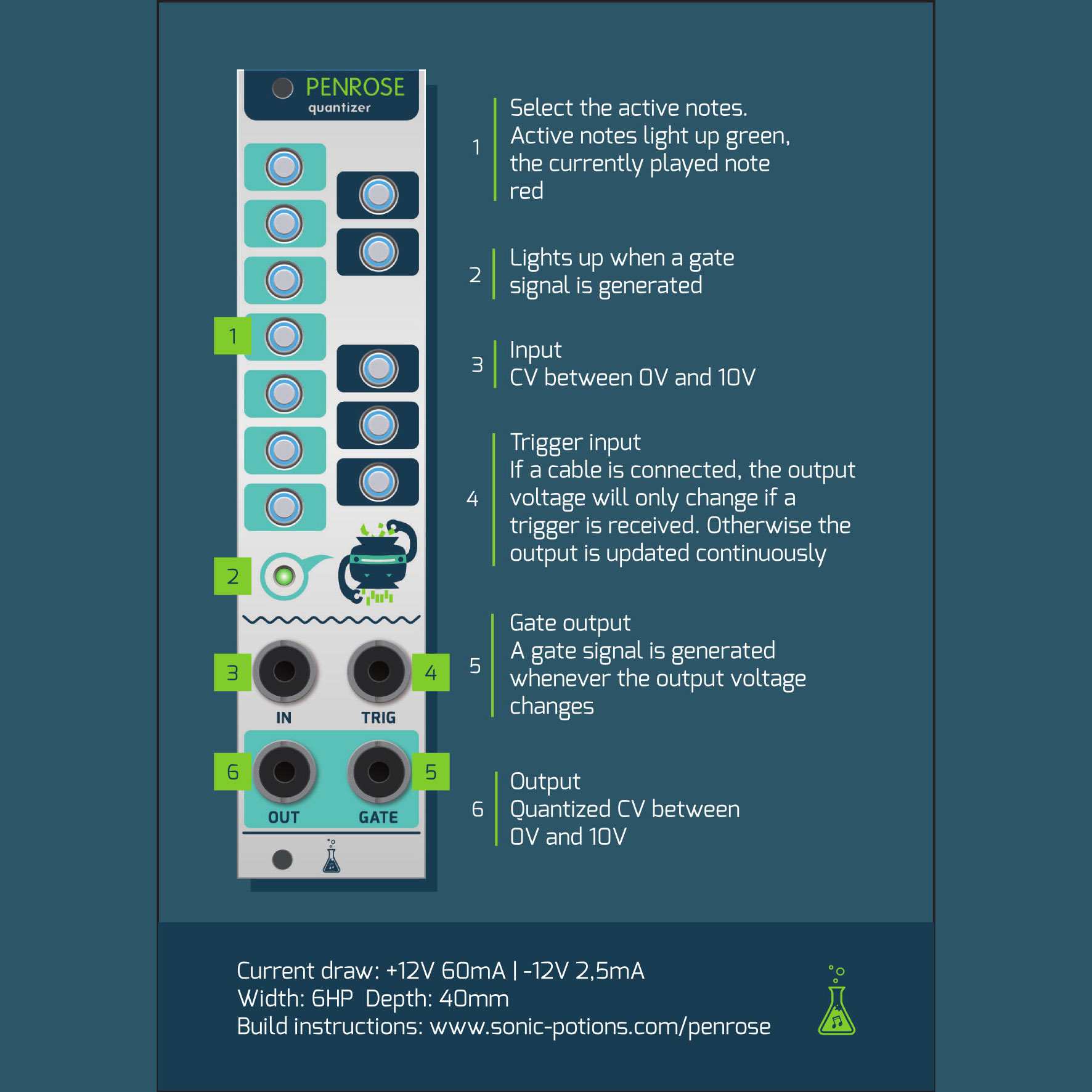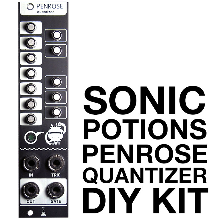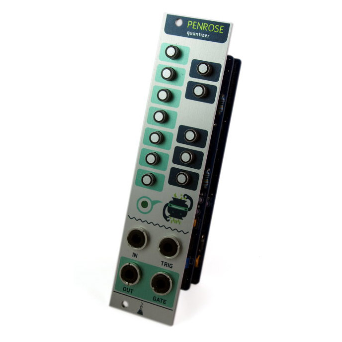 Penrose is a simple CV quantizer DIY kit for the eurorack format. It takes an incoming continuous CV voltage and converts it to the nearest note in a scale. Active notes can be selected with the 12 buttons. You can use it to tune the output of your analog sequencer, as a semi random melody generator, for fast chiptune arpeggios and much more.