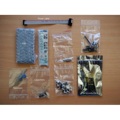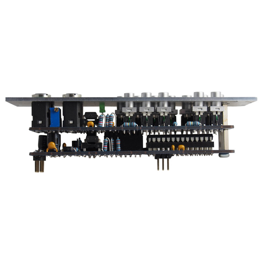 It comes as a complete kit with all needed parts to build it. That includes a multi colour aluminum frontpanel, high quality jacks and illuminated bi-color push buttons.