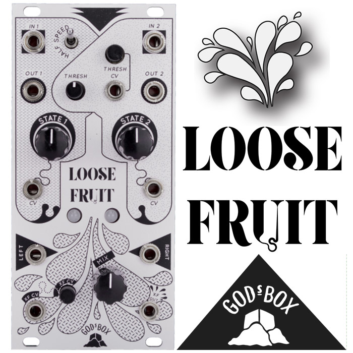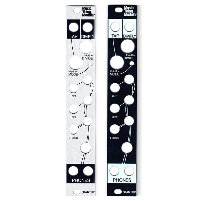 The Diviply output produces a second clock signal related to the main clock – tap the button to select a faster division (or multiplication), hold to select a slower clock. There are two modes: When the the mode light is off, clocks coming out from Diviply are Even; ratios of 2,4,8,16. When the light is on, they are odd; 1, 3, 6. Switch modes by holding ‘Tap’.