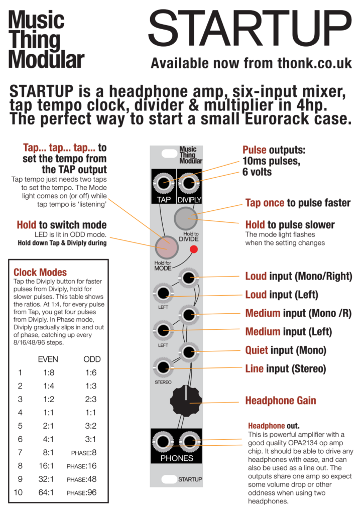 The Music Thing Modular ‘Startup’ is designed to be the best way to help start a small Eurorack case. This 4HP module does three things: