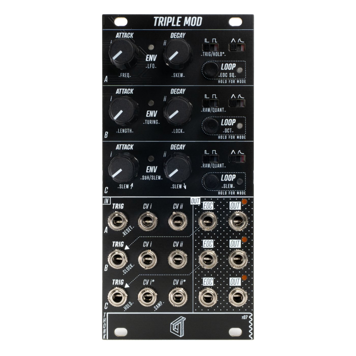 Triple Mod is a 12HP 3 channel modulation source. The default state for each channel is a an Attack / Decay envelope generator with CV control over rise and fall times, looping, linear/logarithmic slopes, trigger/gate modes and an end-of-cycle (EOC) output.