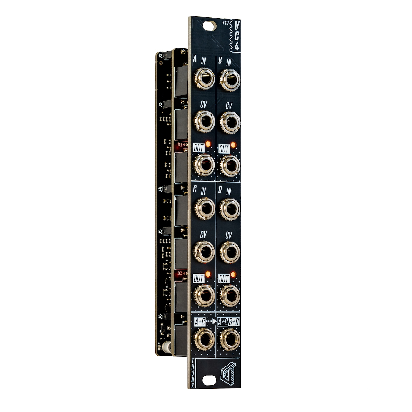 The t10 VC4 from Thonk Synth is a 4HP Eurorack quad voltage controlled amplifier module. The module features four identical linear, DC coupled high-quality VCA channels, labelled A, B, C & D.