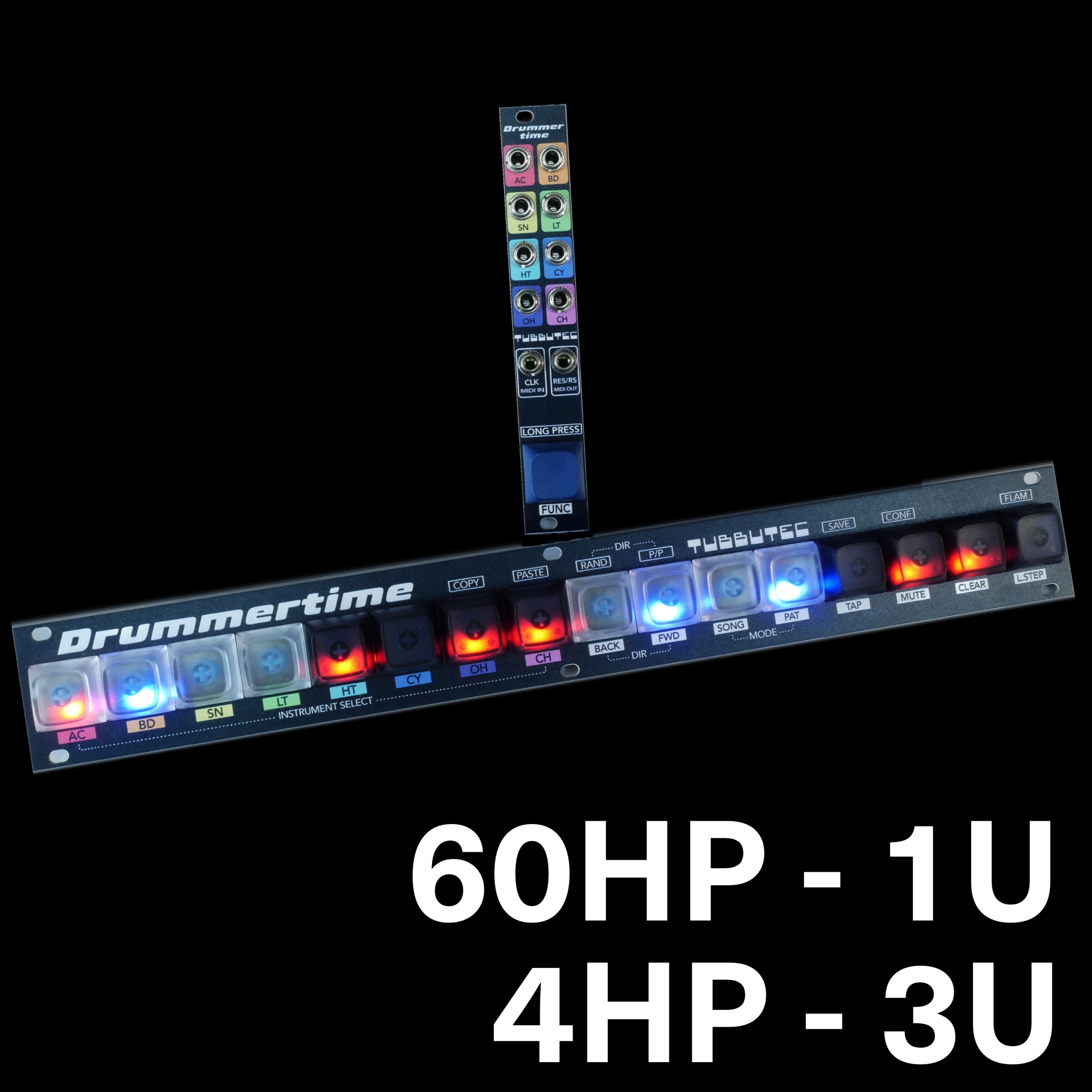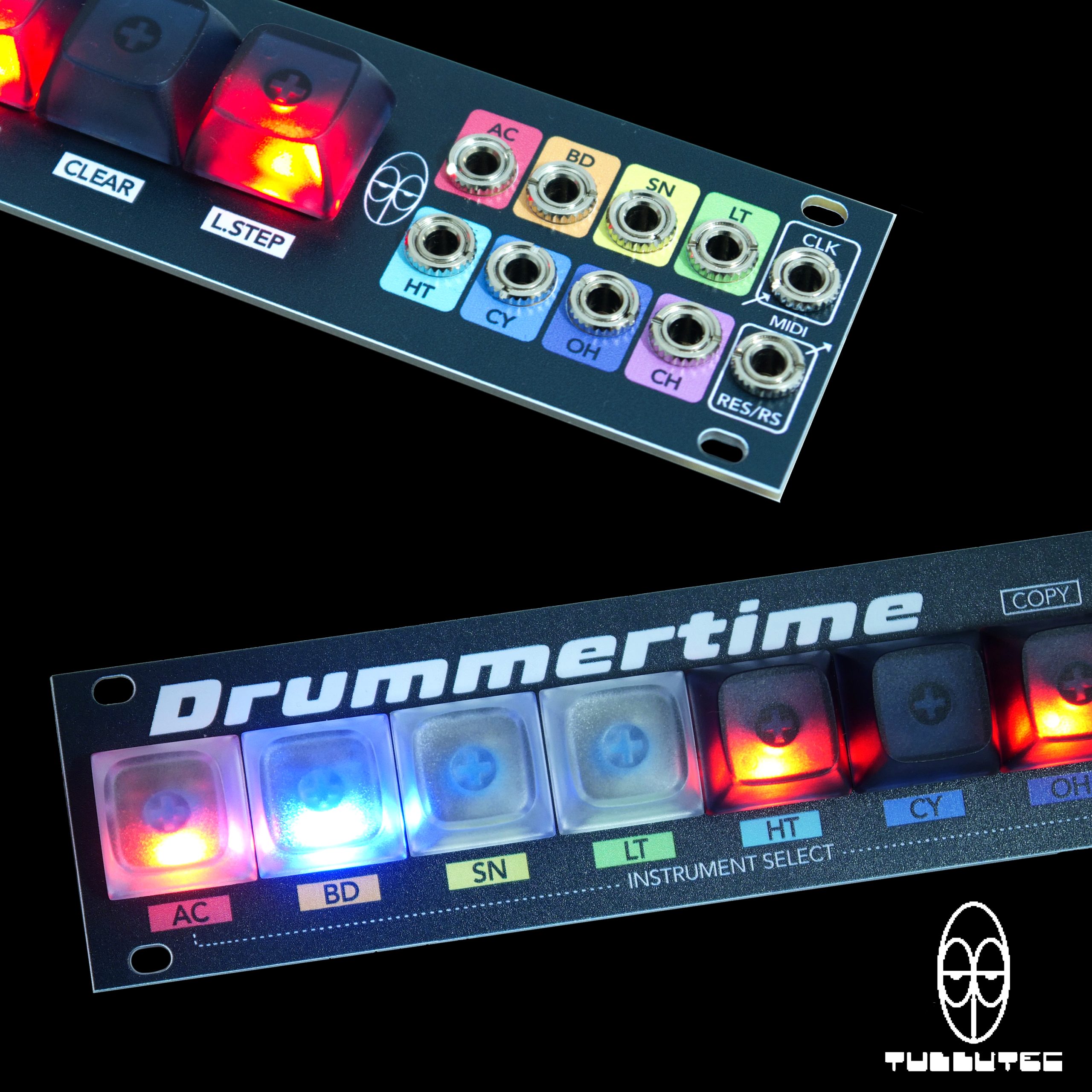 Tubbutec Drummertime is a TR-x0x-inspired step sequencer for drums and modular trigger sequencing. The (Intellijel format) 1U interface allows for large and playable, clicky tactile buttons, and the sequencer is optimized for live performance and allows quick programming and editing of drum patterns. The instrument outputs can send either triggers or gates.